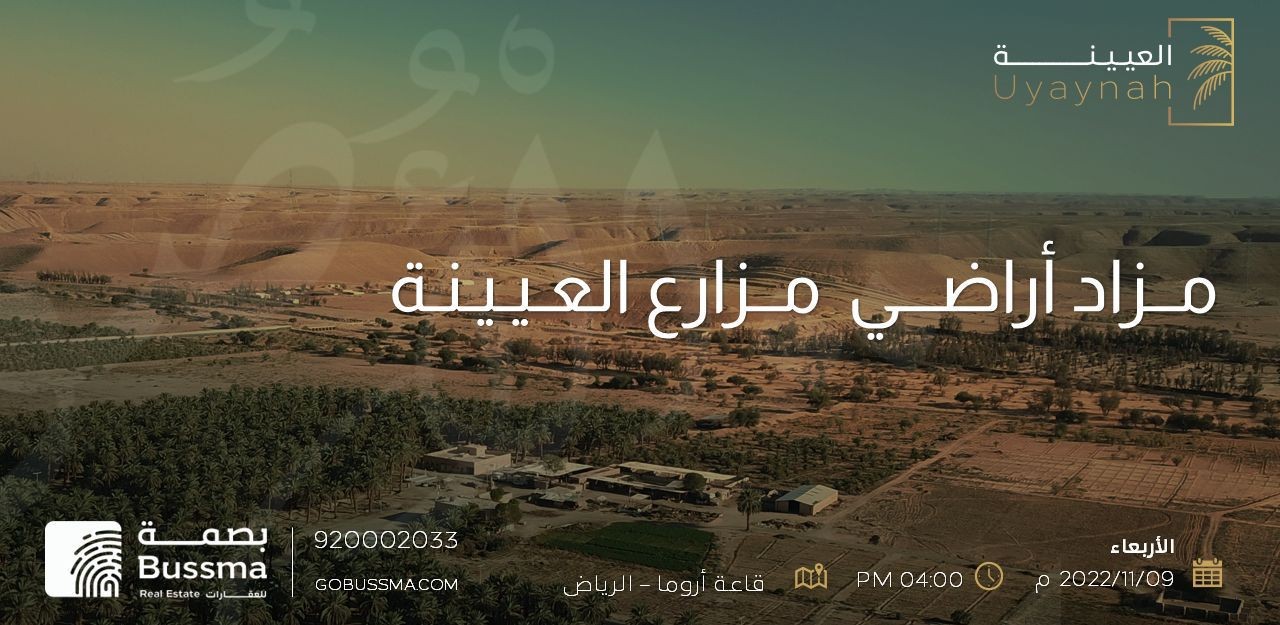 ويعتبر هذا المزاد أحد أهم الفرص الإستثمارية الواعدة بمركز العيينة التابعة لمحافظة الدرعية وذلك لما تشهده من تطور ملحوظ بالبنية التحتية و الخدمات و المرافق كونها أحد أهم مناطق الاستثمار و وجهة جاذبة للمستثمرين بالقطاع الزراعي والسياحي وكذلك الترفيهي بالإضافة إلى النمو السكاني والامتداد العمراني الذي تشهده .