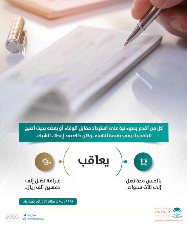 “النيابة العامة”: إصدار شيك بدون رصيد عقوبته السجن 3 سنوات وغرامة تصل 50 ألف ريال