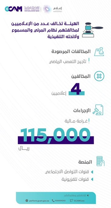 اعلنت الهيئة العامة للإعلام المرئي والمسموع عن مخالفة 4 إعلاميين رياضيين لتأجيج التعصب الرياضي واتخاذ الإجراءات النظامية بحقهم وفرض عليهم غرامة بـ 115 ألف ريال.