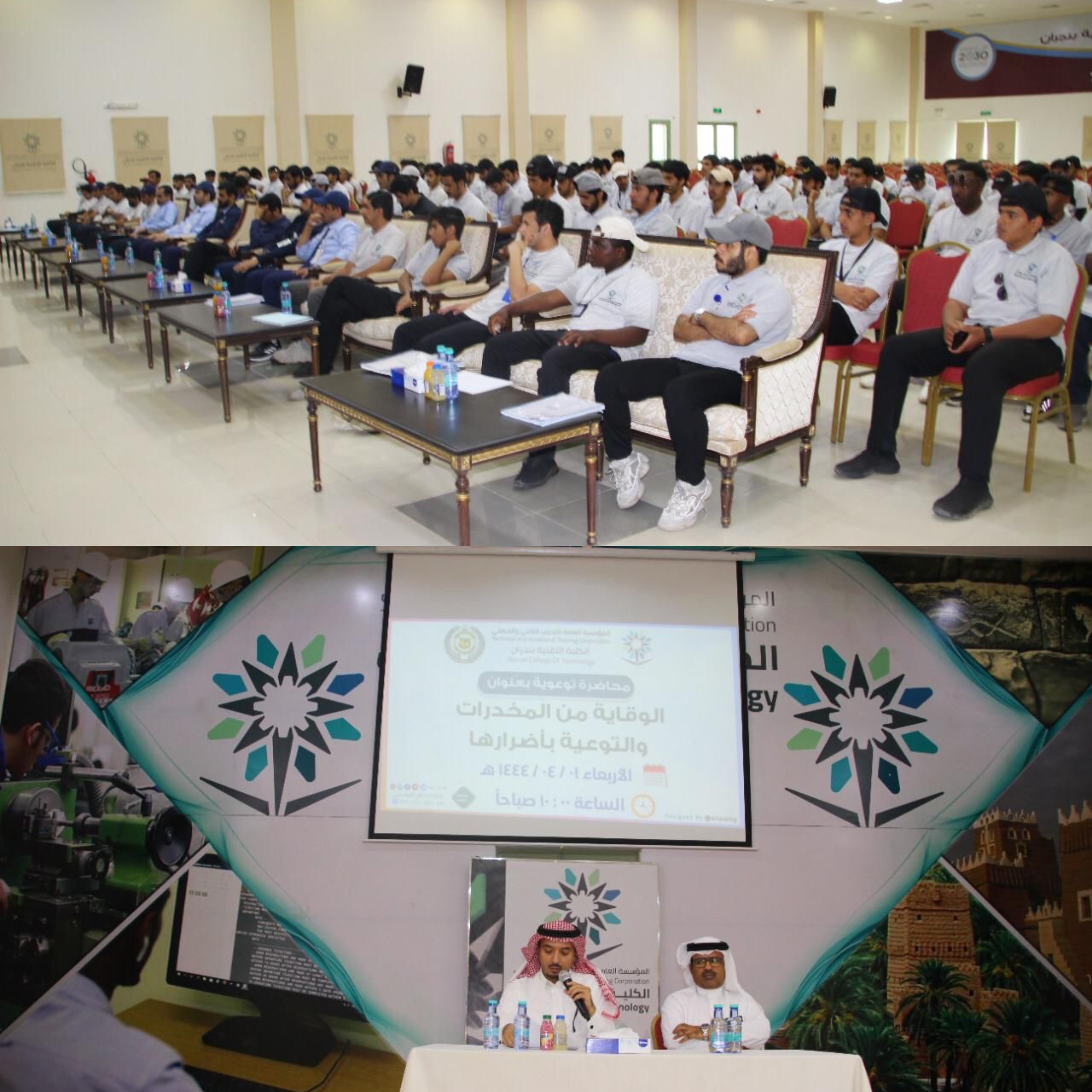 وأبان عميد الكلية محمد بن علي زبعان الصقري أن المحاضرة تأتي من ضمن مبادرات المؤسسة العامة للتدريب التقني والمهني لتوعية بأضرار المخدرات (حماية )، مؤكداً أن رفع الوعي لدى جميع فئات المجتمع بخطورة المخدرات له دور كبير في القضاء على هذه الآفة.