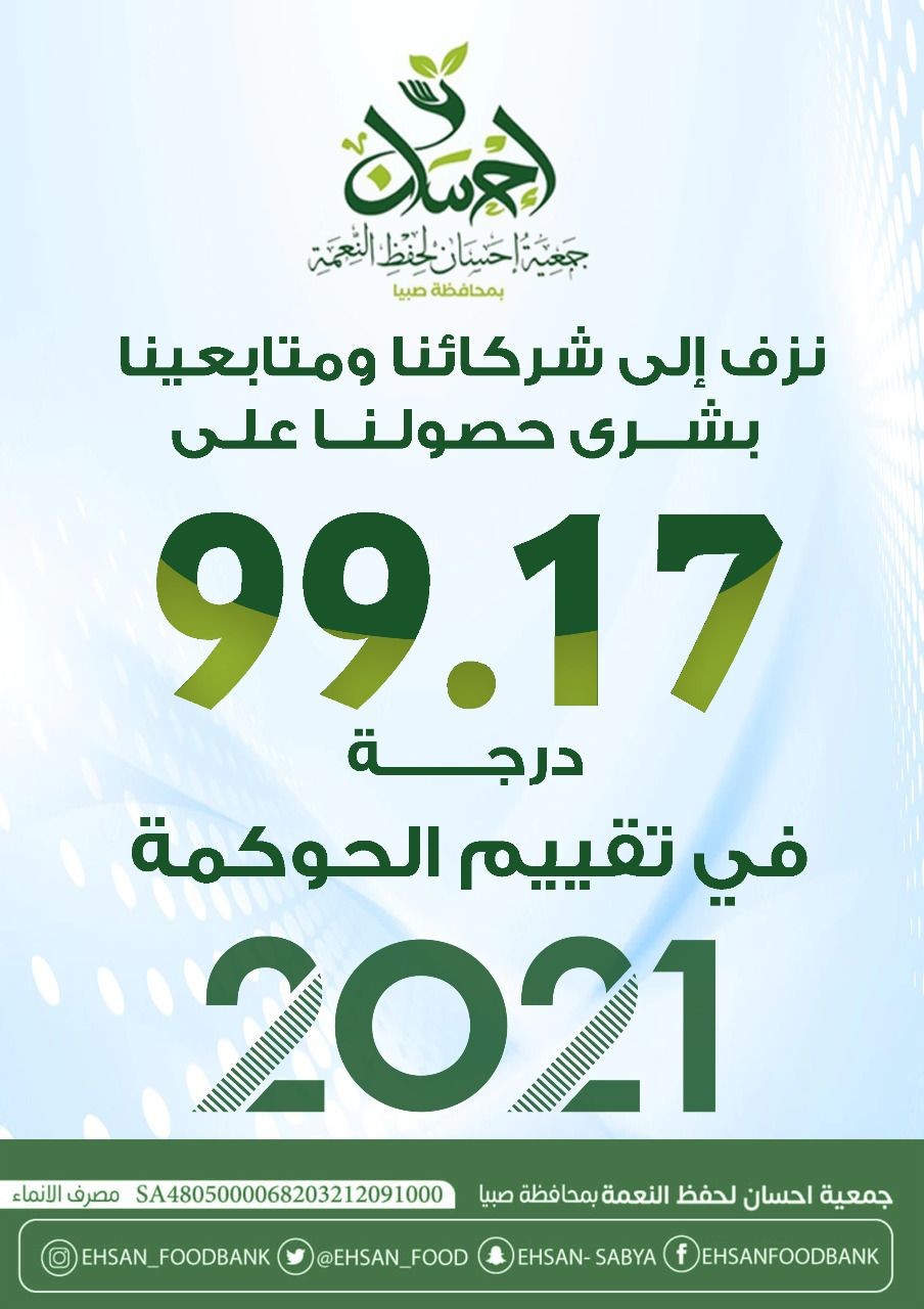 يسعى مجلس إدارة جمعية إحسان لحفظ النعمة منذ انطلاقتها لتطبيق معايير الحوكمة وجاء نتاج ذلك عند صدور التقييمات في الحوكمة وحصلت الجمعية على درجة ٩٩.١٧ في هذا التقييم لعام ٢٠٢١م وفق المعايير الثلاثة : الالتزام والامتثال الشفافية والإفصاح السلامة المالية ليؤكد هذا التقييم مستوى العمل الكبير في إدارة جمعية إحسان لحفظ النعمة.