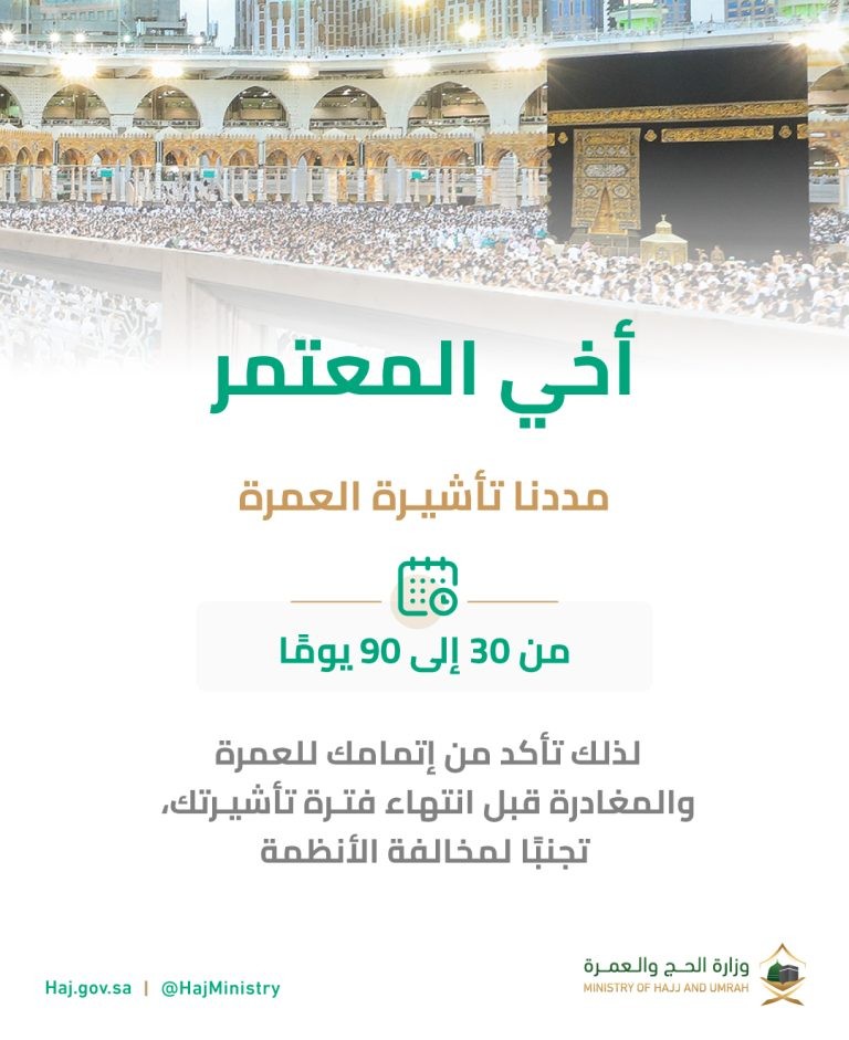 أعلنت وزارة الحج والعمرة، عن تمديد تأشيرة العمرة من 30 إلى 90 يوماً.
