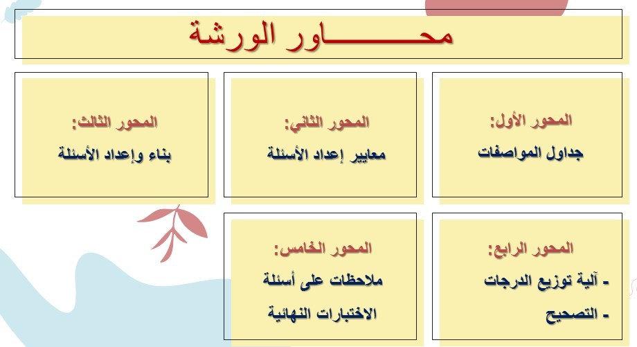 تناولت الورشة كيفية وضع أسئلة الاختبارات العملية في مقررات المرحلة الثانوية، جداول المواصفات ومناقشتها، معايير إعداد الأسئلة ومناقشتها، توظيف جداول المواصفات في بناء وإعداد الأسئلة، آلية توزيع الدرجات والتصحيح، وعمل تدريب للمعلمات الأولى بالرعاية والمستجدات على وضع الأسئلة وفقاً لجداول المواصفات.