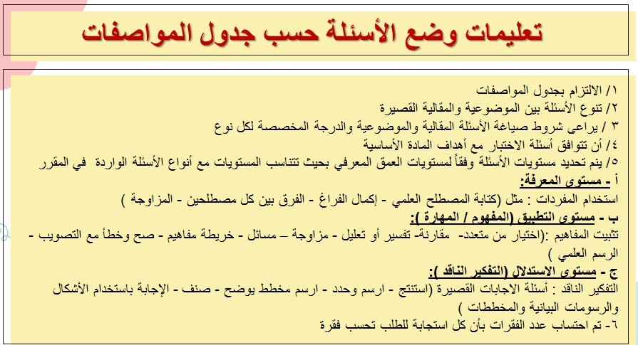 واختتمت بضرورة وضع أسئلة الاختبارات للفصل الدراسي الأول وفقاً لجداول المواصفات.