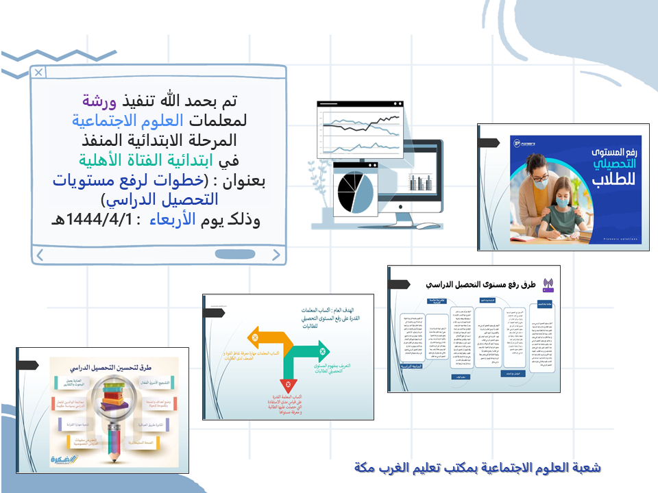 أعدتها مشرفة العلوم الاجتماعية: مريم مليباري بهدف إكساب معلمات العلوم الاجتماعية - المرحلة الابتدائية القدرة على رفع المستوى التحصيلي للطالبات من خلال التعريف بمفهوم المستوى التحصيلي للطالبات، وإكساب المعلمات مهارة معرفة نقاط القوة والضعف لدى الطالبات، وإكسابهن القدرة على قياس مدى الاستفادة التي حصلت عليها الطالبة ومعرفة مستواها.