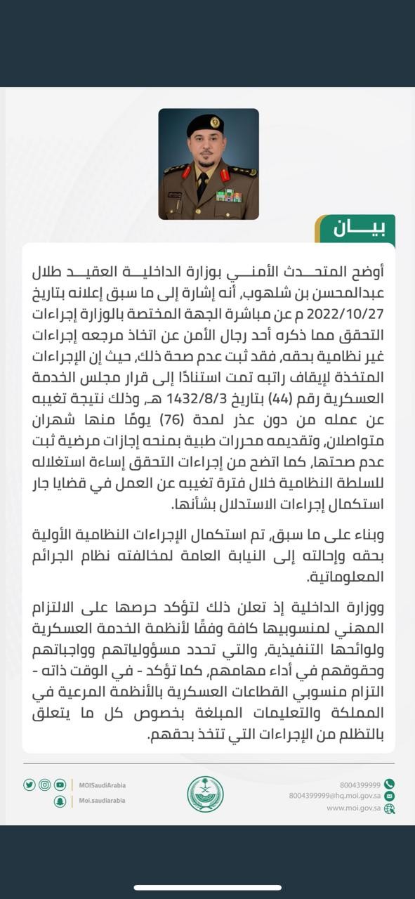 وأوضح المتحدث الأمني بوزارة الداخلية العقيد طلال الشلهوب بأن قرار إيقاف راتب رجل الأمن جاء لتغيبه عن عمله من دون عذر (76) يوم منها شهران متواصلان، وتقديمه محررات طبية بمنحه إجازات مرضية ثبت عدم صحتها، وأحيل إلى النيابة العامة لمخالفته نظام الجرائم المعلوماتية، كما اتضح خلال إجراءات التحقق إساءة استغلاله للسلطة النظامية خلال فترة تغيبه عن العمل في قضايا جار استكمال إجراءات الاستدلال بشأنها.