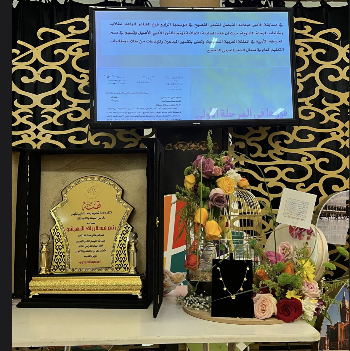 ثانوية رملة بنت أبي سفيان تكرم الطالبة رنيم الزهراني الفائزة بمسابقة الشعر الفصيح
