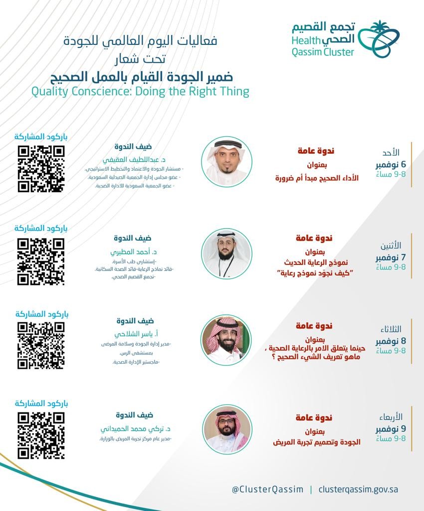يطلق تجمع القصيم الصحي الأحد القادم برنامج فعاليات اليوم العالمي للجودة والذي يقام لمدة خمسة أيام عن بعد عبر تقنية الزوم تحت شعار" ضمير الجودة القيام.. بالعمل الصالح"