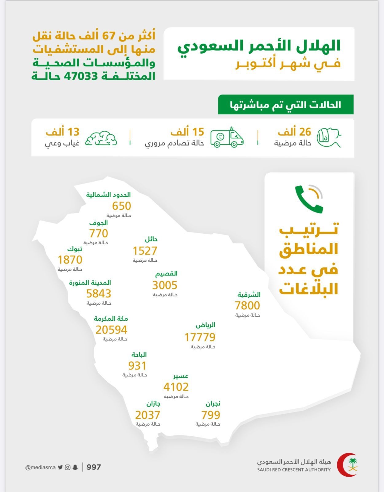 باشرت هيئة الهلال الأحمر السعودي أكثر من 67 ألف حالة خلال شهر أكتوبر 2022م، نقلت منها الى المستشفيات والمؤسسات الصحية المختلفة 47033 حالة.