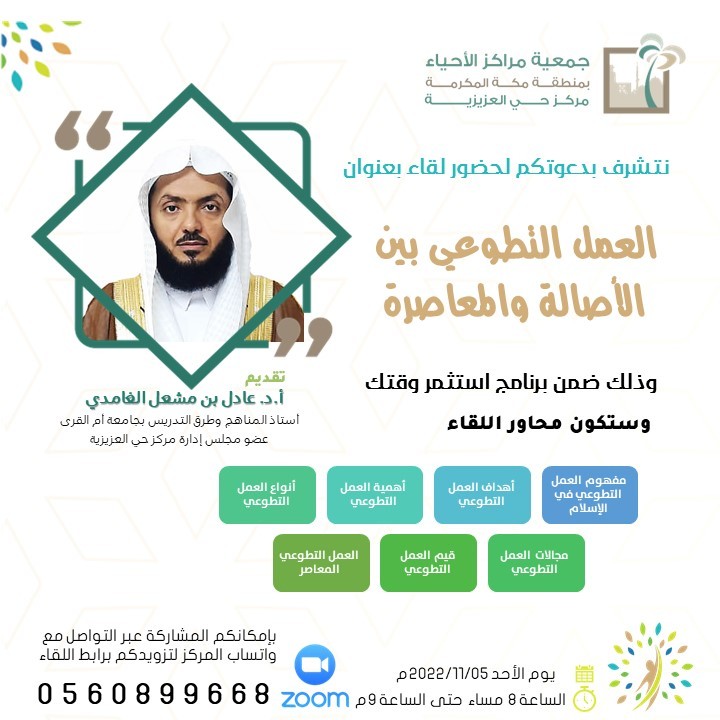 نظم مركز حي العزيزية بمكة المكرمة لقاء عن بعد عبر برنامج الزوم وذلك بعنوان (العمل التطوعي بين الأصالة والمعاصرة) قدمه الأستاذ الدكتور/ عادل بن مشعل الغامدي، عضو مجلس إدارة المركز، وذلك مساء يوم الأحد الموافق 12/ 4/ 1444