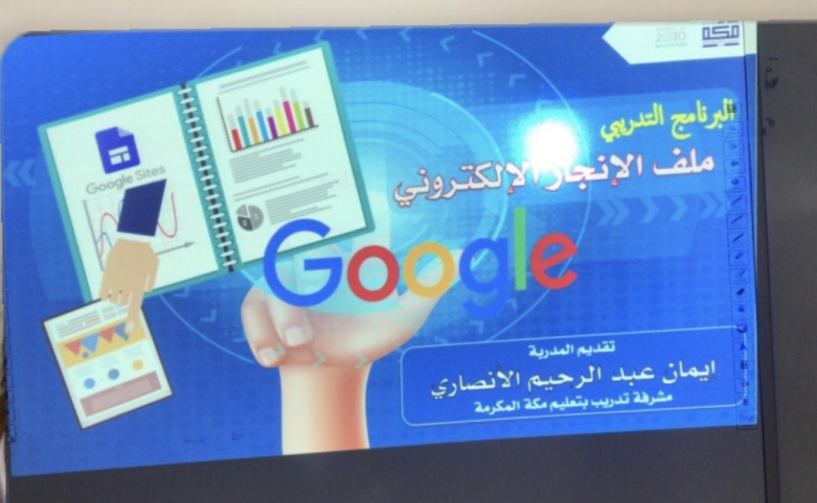 وذلك بهدف التطوير المهني لمنسوبات المدرسة حيثُ تم عبر تطبيق عملي التعريف بملف الإنجاز الإلكتروني بدقة ن كما تم شرح أدوات برنامج google sites، والتدريب على تصميم ملف إنجاز إلكتروني بشكل صحيح.