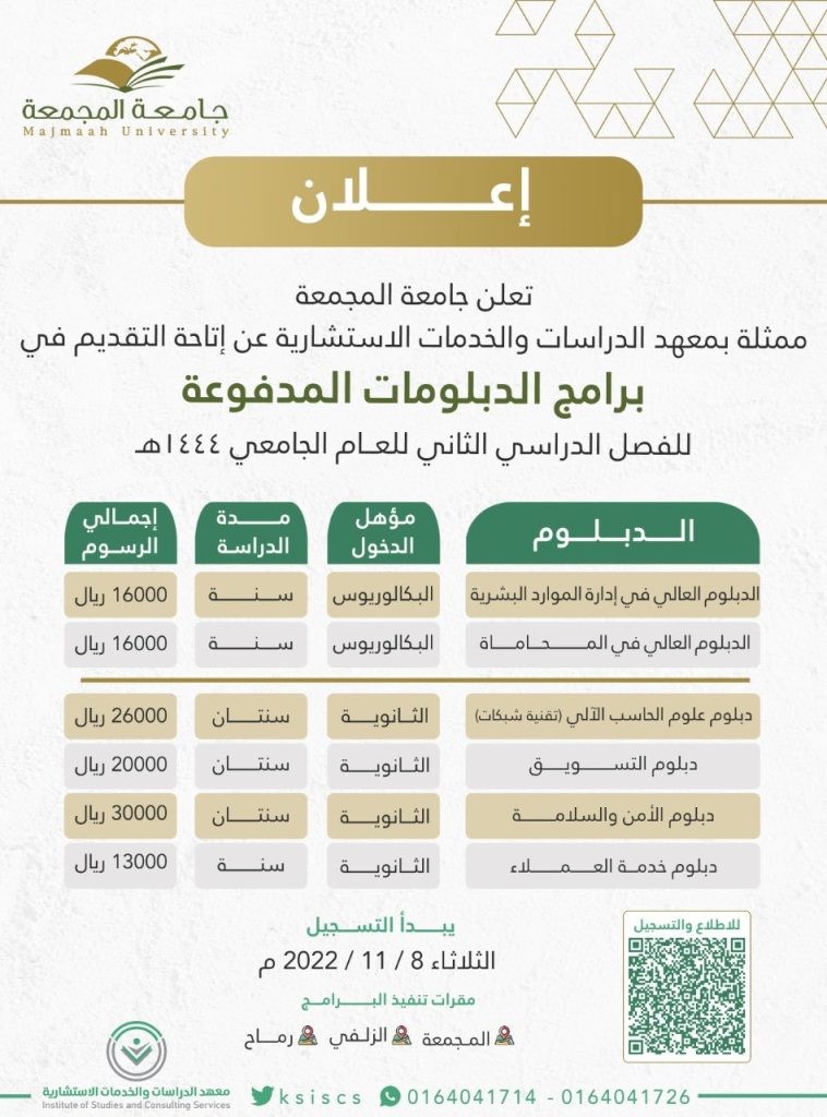 اعلنت جامعة المجمعة ممثلة بمعهد الدراسات والخدمات الاستشارية عن إتاحة القبول في البرامج التعليمية ( الدبلومات ) المدفوعة للفصل الدراسي الثاني للعام الجامعي ١٤٤٤هـ .
