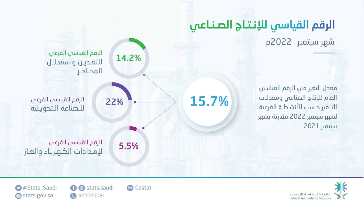 وأظهرت نتائج النشرة ارتفاع مؤشر الرقم القياسي للإنتاج الصناعي لشهر سبتمبر من عام 2022م بنسبة (15.7%)، مقارنةً بالشهر المماثل من العام السابق (سبتمبر 2021م)؛ وجاء ذلك نتيجة