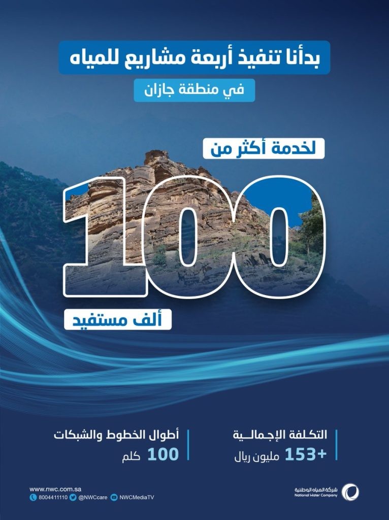 أعلنت شركة المياه الوطنية أنها بدأت في تنفيذ 4 عقود تخص مشاريع حيوية في محافظات جازان، بهدف تحسين الكفاء التشغيلية للخدمات المائية في المحافظات بتكلفة مالية تجاوزت (153) مليون ريال وذلك لخدمة (100) ألف مستفيد.