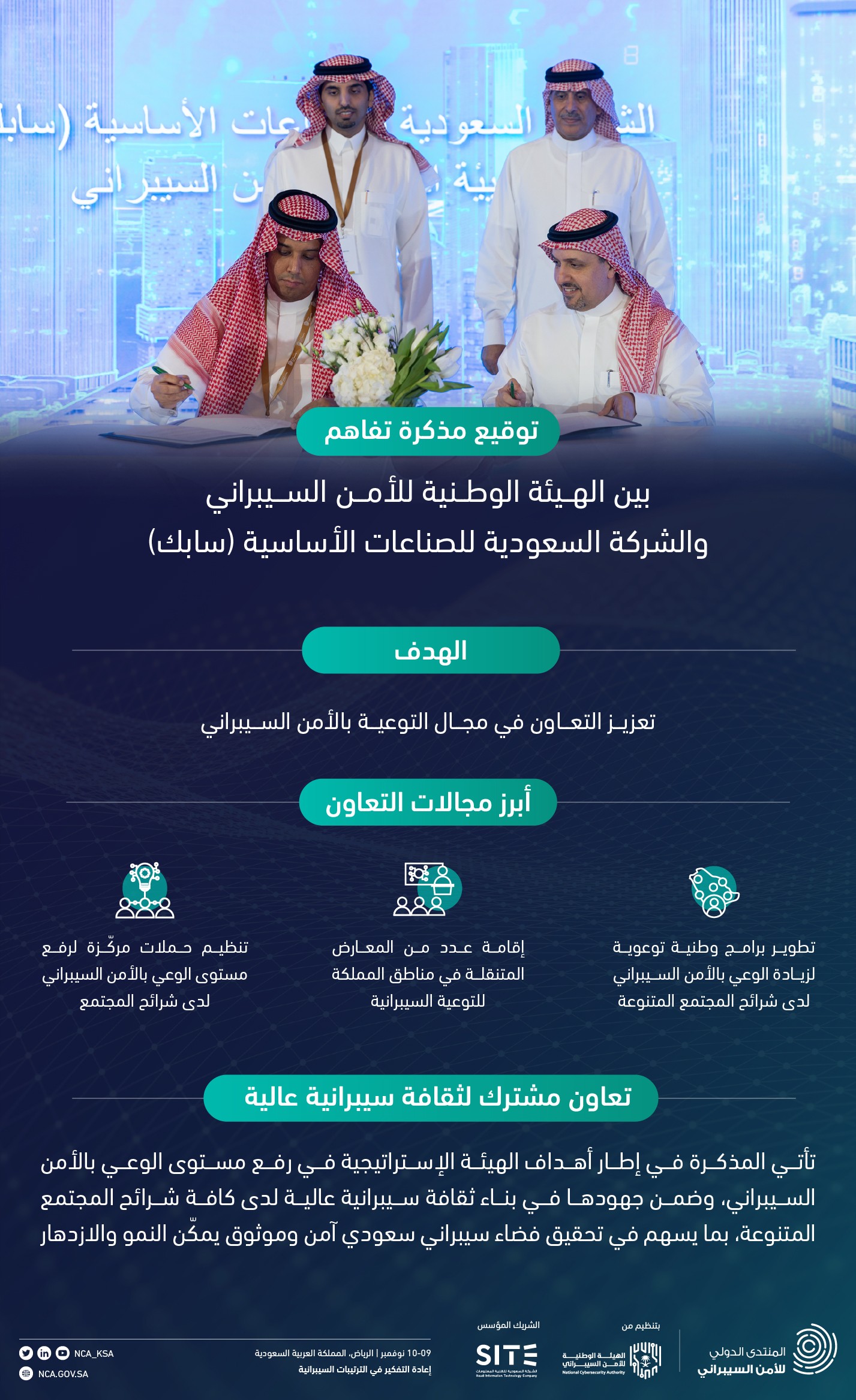 وقعت الهيئة الوطنية للأمن السيبراني مذكرة تفاهم مع الشركة السعودية للصناعات الأساسية «سابك» للتعاون في مجال التوعية بالأمن السيبراني، وذلك على هامش أعمال النسخة الثانية من المنتدى الدولي للأمن السيبراني الذي تنظمه الهيئة تحت شعار (إعادة التفكير في الترتيبات السيبرانية العالمية) خلال الفترة 9-10 نوفمبر 2022 في مدينة الرياض.