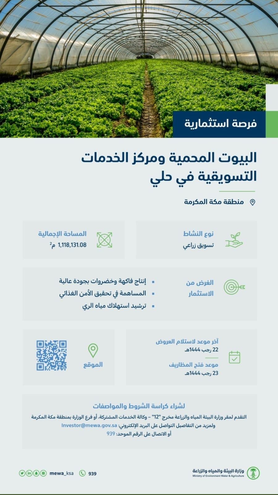 أعلنت وزارة البيئة والمياه والزراعة، اليوم، عن طرح فرصة استثمارية في البيوت المحمية ومراكز الخدمات التسويقية في حلي بمحافظة القنفذة بمنطقة مكة المكرمة.
