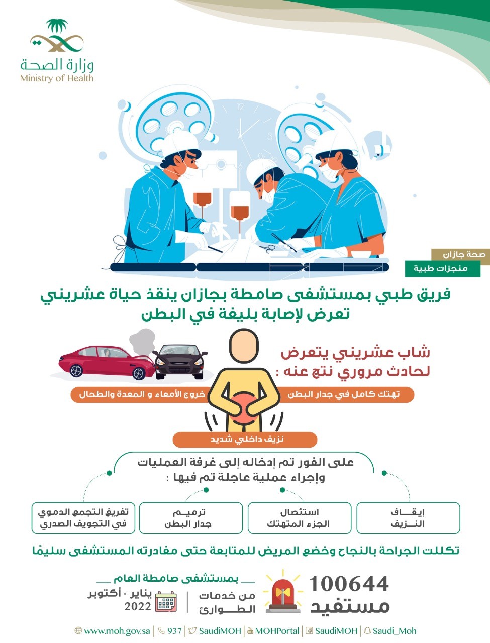 قالت الصحة في جازان بأن فريق طبي مكون من أطباء الجراحة العامة تمكن من إنقاذ حياة عشريني تعرض لإصابة بليغة في البطن وذلك بإجراء عملية جراحية عاجلة تم فيها إيقاف النزيف واستئصال الجزء المتهتك من الأمعاء وترميم جدار البطن إضافة الى تفريغ التجمع الدموي في التجويف الصدري تكللت بالنجاح ولله الحمد .