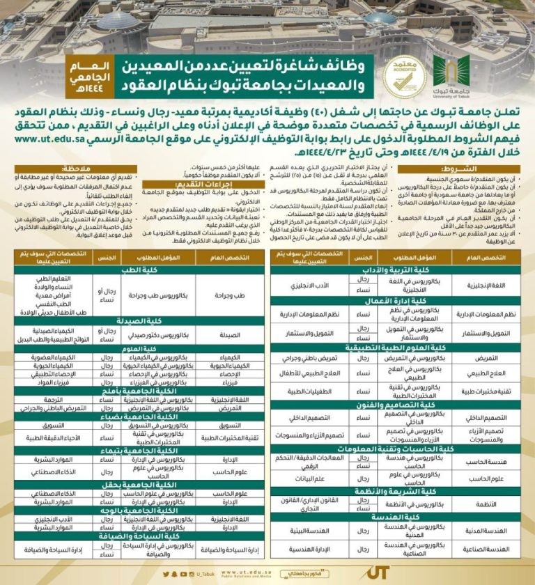 اعلنت جامعة تبوك انه رغبه منها بإتاحة الفرصة للمتقدمين والمتقدمات على وظيفة (معيد) والتي سبق الإعلان عنها مؤخراً لاستكمال إجراءات تقديمهم وفق المؤهلات والشروط المطلوبة،