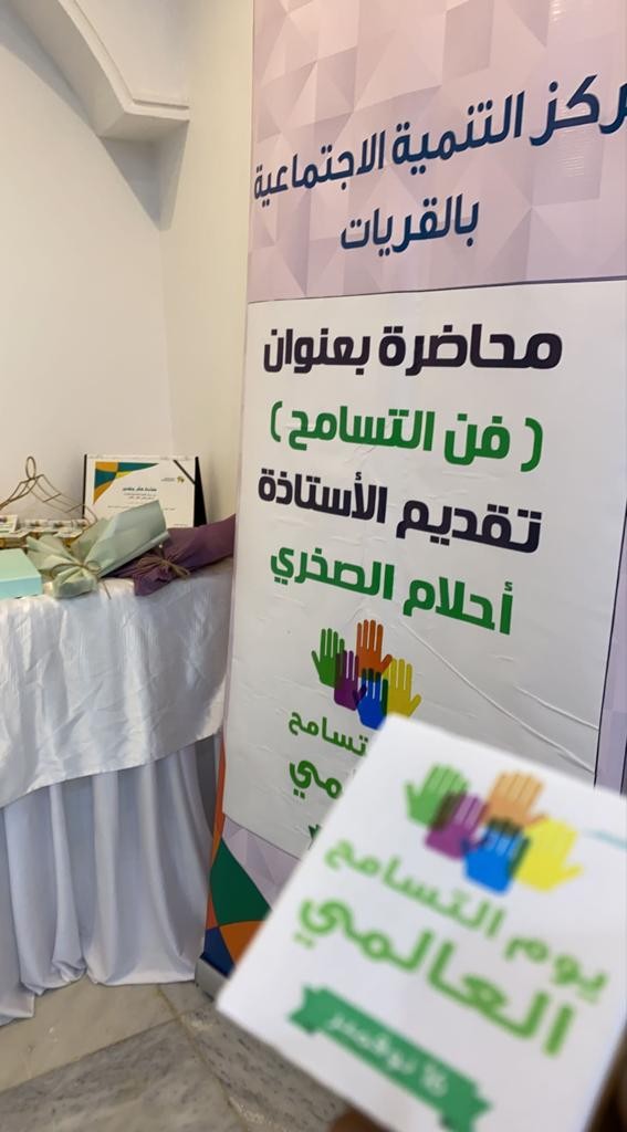 مركز التنميه الاجتماعيه بالقريات يفعل اليوم العالمي للتسامح ويقيم محاضره بعنوان (فن التسامح)