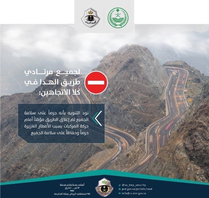 وأوضح الحساب الرسمي لإمارة منطقة مكة المكرمة على موقع “تويتر” أنه “تم إغلاق طريق الهدا إغلاقًا مؤقتًا احترازيًّا في كلا الاتجاهين بسبب هطول الأمطار”.