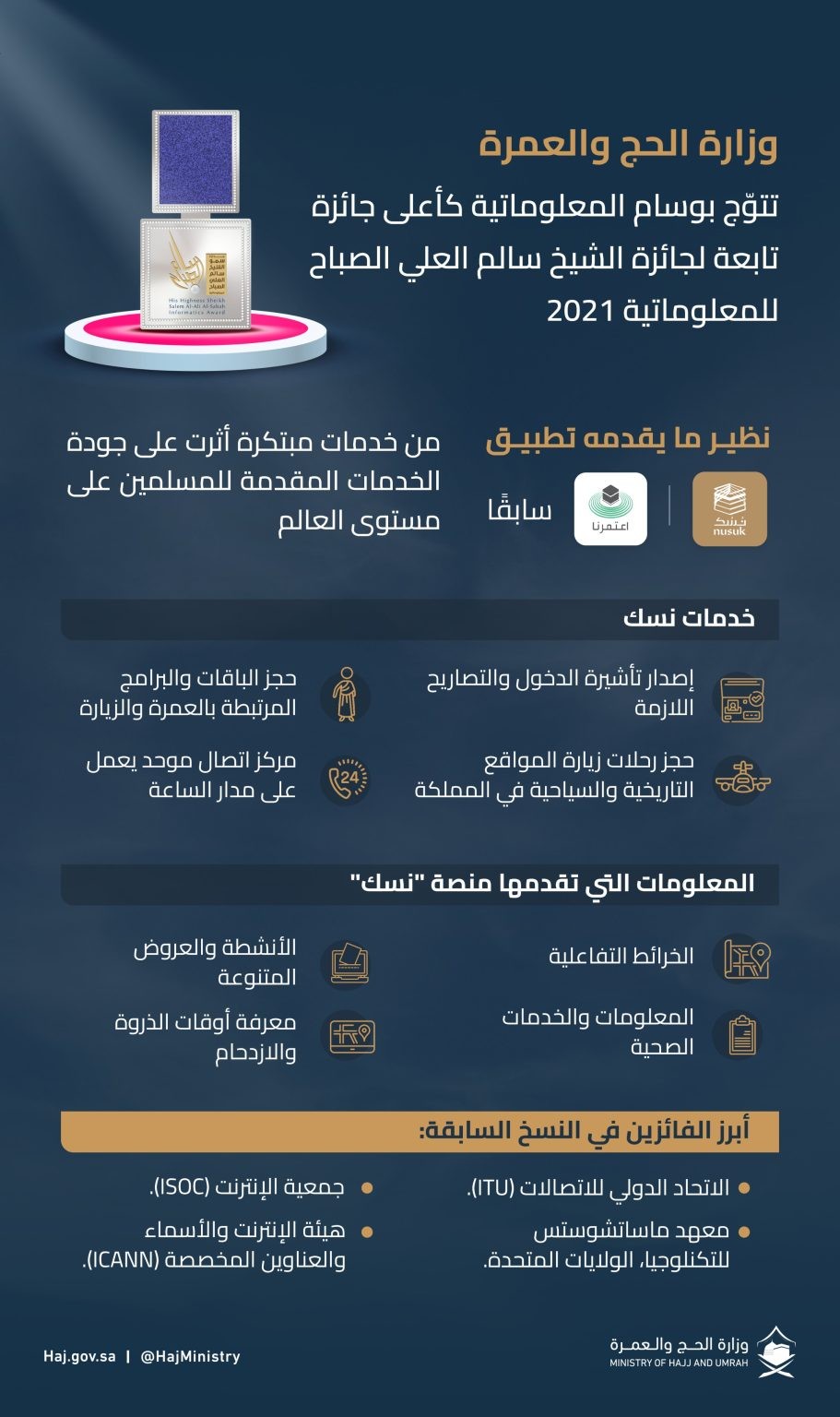 حصلت وزارة الحج والعمرة خلال حفل تكريم الفائزين بجائزة المعلوماتية في دورتها الحادية والعشرين (2021) اليوم في الكويت, على “وسام المعلوماتية” كأعلى وسام تابع لجائزة الشيخ سالم العلي الصباح للمعلوماتية، في نسختها للعام 2021.