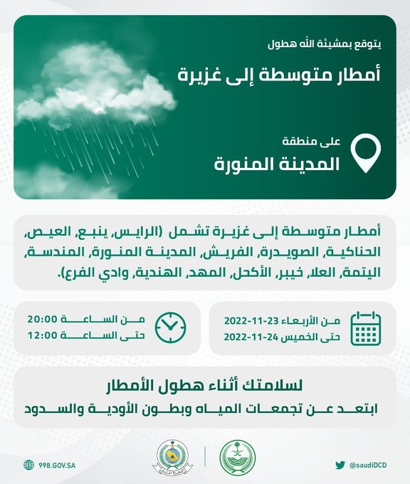 حذّرت المديرية العامة للدفاع المدني اليوم الاربعاء بأنه ووفقاً لما ورد إليها من المركز الوطني للأرصاد من فرصة هطول أمطار متوسطة إلى غزيرة على منطقة المدينة المنورة حتى يوم الخميس الساعة 12 مساءً.