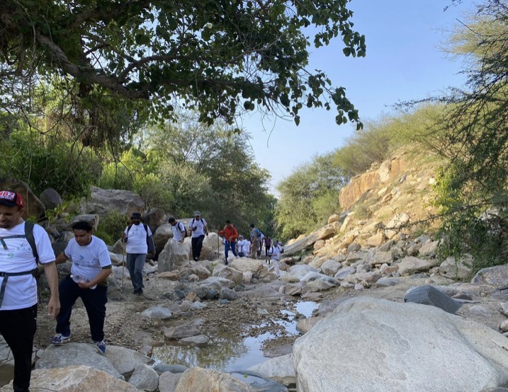 وذكر عضو لجنة تنظيم البرنامج المرشد السياحي الأستاذ عبدالله الرفاعي أن نقطة التجمع والتخييم كانت في مطل العارضة وأن انطلاق الهايكنج الساعة السابعة صباحاََ عبر مسار وادي العين وهو عبارة عن انشقاق صخري، يبدأ المسار بالقرب من منتزه الأمير محمد بن ناصر بالعارضة والذي يبعد عن المسار حوالي 2.5كلم ويبلغ المسار حوالي 3 كلم ذهاباََ واياباََ في منطقة شبه مستوية يتميز الطقس فيها بالاعتدال شتاءََ ودافئ صيفاََ كما يغطى المسار بأنواع من النباتات المختلفة مثل التين والتوت البري والاراك والطلح وأشجار القتاد والنباتات العطرية وتجري به المياه طوال السنة.
