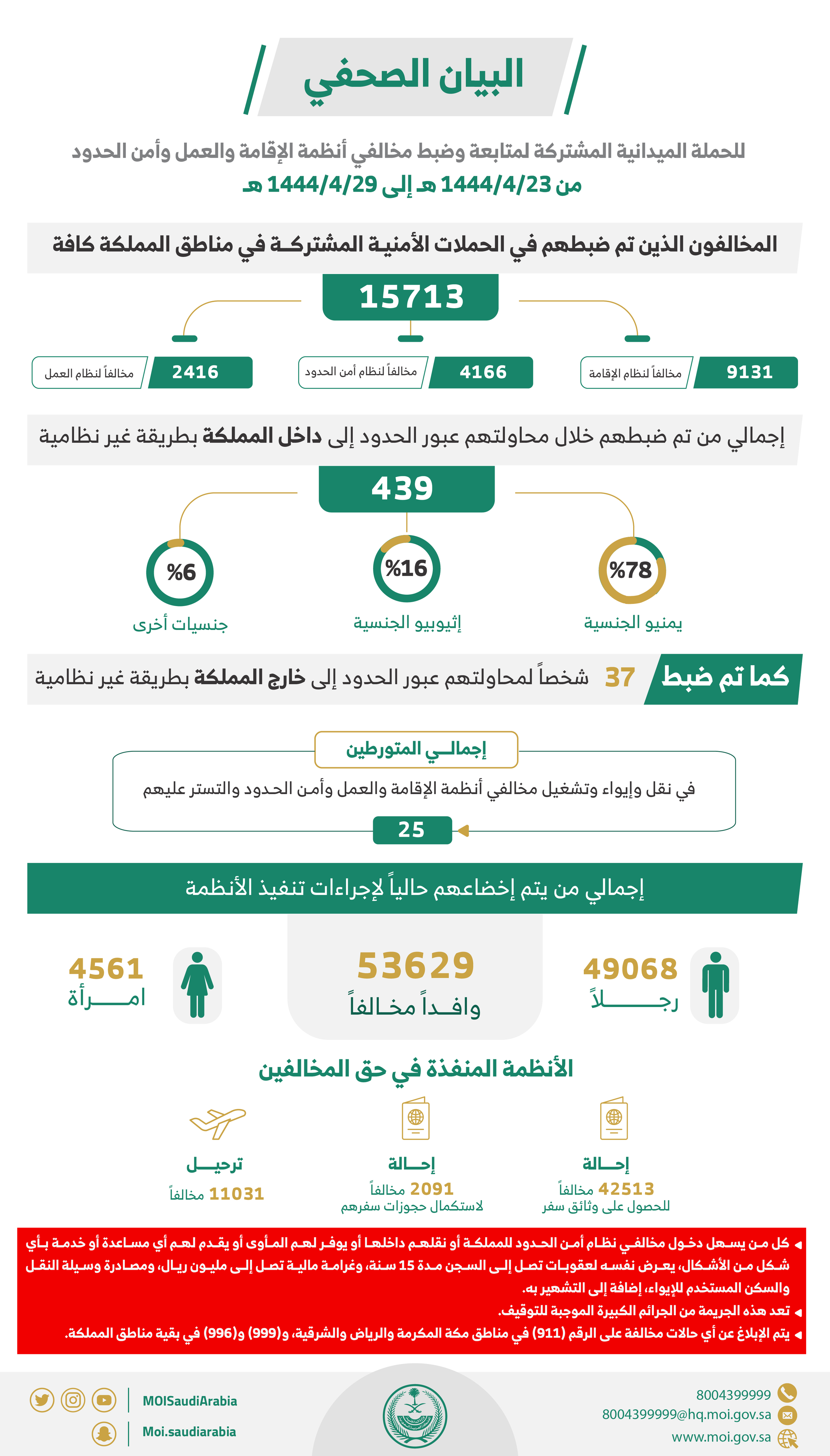 أسفرت الحملات الميدانية المشتركة لمتابعة وضبط مخالفي أنظمة الإقامة والعمل وأمن الحدود، التي تمت في مناطق المملكة كافة، وذلك للفترة من 23 / 4 / 1444هـ الموافق 17 / 11 / 2022م حتى 29 / 4 / 1444هـ الموافق 23 / 11 / 2022م، عن النتائج التالية: