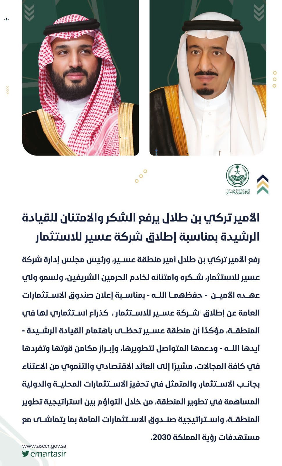 الأمير تركي بن طلال يرفع الشكر والامتنان للقيادة الرشيدة بمناسبة إطلاق شركة عسير للاستثمار