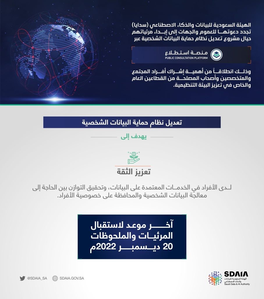 جددت الهيئة السعودية للبيانات والذكاء الاصطناعي (سدايا) دعوتها لعموم الأفراد والجهات لإبداء مرئياتهم حول مشروع تعديل نظام حماية البيانات الشخصية، من خلال المنصة الإلكترونية الموحدة لاستطلاع آراء العموم والجهات (منصة استطلاع) التابعة للمركز الوطني للتنافسية وذلك في موعد أقصاه 20 / 12 /2022م، سعياً من الهيئة إلى تحقيق أعلى درجات الشفافية وإشراك العموم والجهات في دعم وتطوير البيئة التنظيمية لقطاع البيانات في المملكة.