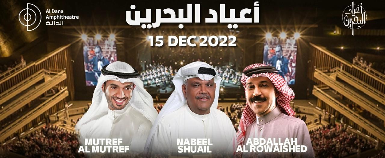 مسرح الدانة، الوجهة الأمثل لاستضافة الفعاليات الترفيهية الحية في مملكة البحرين، يستضيف حفلات العيد الوطني المجيد بالتعاون مع شركة روتانا للصوتيات والمرئيات، والذي من المقرر أن يقوم بإحيائه نخبة من الفنانين الخليجيين وهم: عبدالله الرويشد ونبيل شعيل ومطرف المطرف بتاريخ 15 ديسمبر 2022.