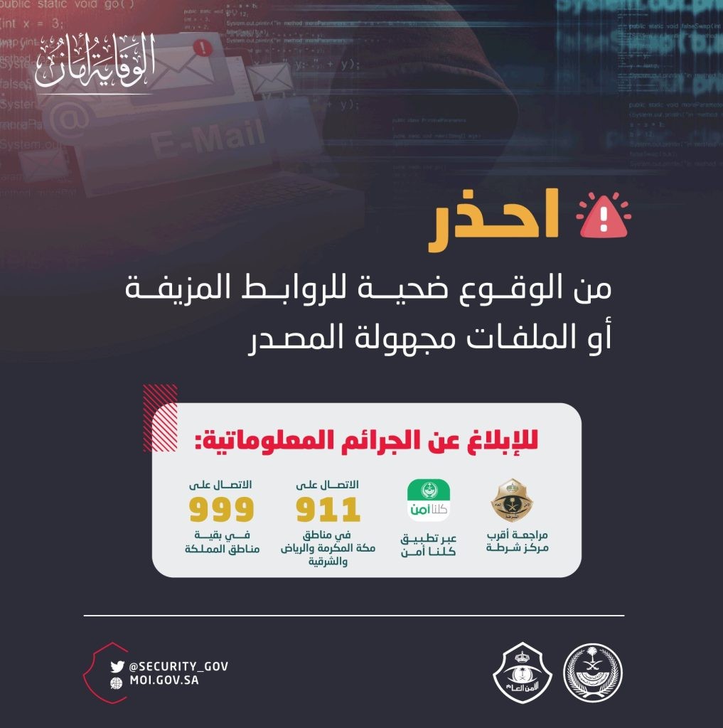 ودعا الأمن العام للإبلاغ عن الجرائم المعلوماتية عبر مراجعة أقرب مركز شرطة، أو عبر تطبيق “كلنا أمن”، أو الاتصال على رقم (911) في مناطق مكة والرياض والشرقية، وعلى (999) في بقية المناطق.