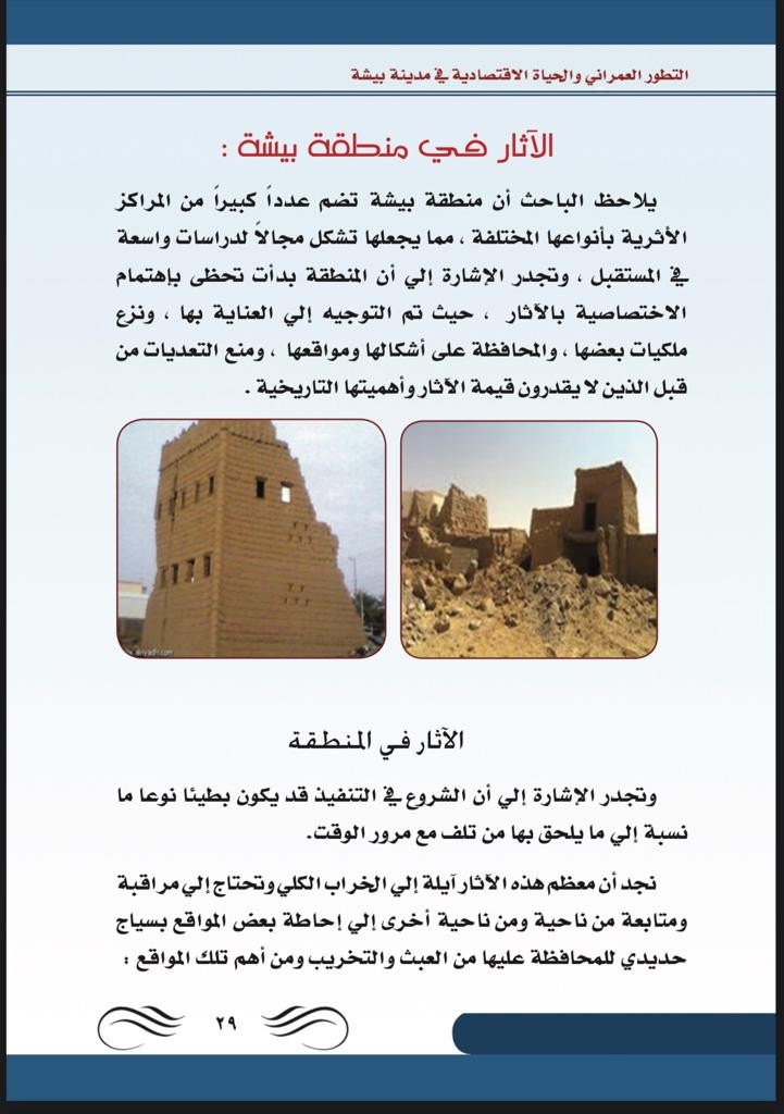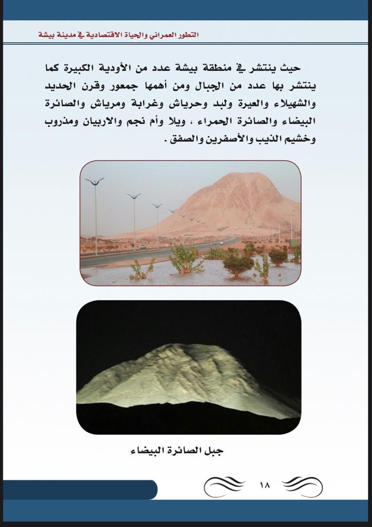 والثاني الحياة الاقتصادية ، وما تقوم به مدينة بيشة من أعمال وما تشتهر به عن المناطق الأخرى من معالم سياحية ومنتجات زراعية وصناعات يدوية وغيرها .
