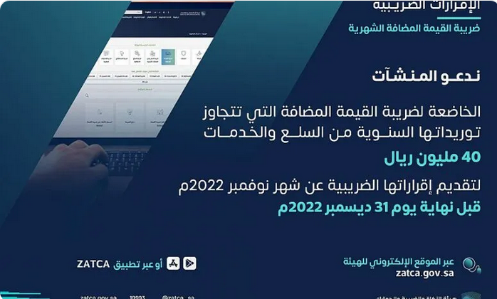 دعت هيئة الزكاة والضريبة والجمارك المكلفين من قطاع الأعمال الخاضعين لضريبة القيمة المضافة التي تتجاوز توريداتها السنوية من السلع والخدمات 40 مليون ريال، إلى تقديم إقراراتهم الضريبية عن شهر نوفمبر الماضي، وذلك في موعدٍ أقصاه 31 من شهر ديسمبر الجاري.