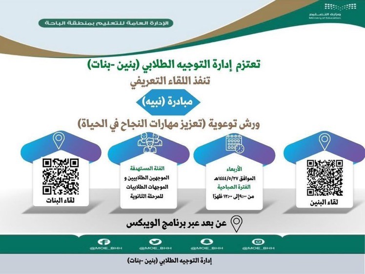 أطلقت الإدارة العامة للتعليم بمنطقة الباحة ممثلة في إدارتي التوجيه الطلابي (بنين - بنات) مبادرة" نبيه"، في جميع مدارس المنطقة من خلال إقامة ورش توعوية عن بعد عبر برنامج "الويبكس" بعنوان (مهارات تعزيز النجاح في الحياة) وتأتي هذه المبادرة ضمن الاستراتيجية الوطنية لمكافحة المخدرات الموجهة لطلبة المرحلة الثانوية، مستهدفة الموجهين والموجهات الطلابيات للمرحلة الثانوية بتعليم المنطقة، بهدف تعريف الطلاب الطالبات بأساليب الرفض وتدريبهم على المهارات الحياتية وتعزيزها لديهم. وتستهدف المبادرة طلاب وطالبات المرحلة الثانوية لرفع الوعي لديهم بأضرار المخدرات والمؤثرات العقلية وأساليب إغرائهم بالمخدرات والمساهمة في التحصين والحماية من الوقوع في تعاطي المخدرات بين الطلاب والطالبات