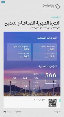 وأوضحت النشرة أن عدد الرخص الصناعية الجديدة، التي أصدرتها الوزارة منذ يناير 2022 وحتى نهاية أكتوبر بلغ 803 تراخيص، باستثمارات بلغت 26.7 مليار ريال، بينما بدأ 939 مصنعاً عمليات الإنتاج خلال الفترة نفسها باستثمارات تصل إلى 26.7 مليار ريال، وتوفير القطاع الصناعي خلال الفترة نفسها 39,372 فرصة وظيفية، مبينة أنه يمكن الاطلاع على النشرة من خلال الرابط التالي: https://mim.gov.sa/newsletters.