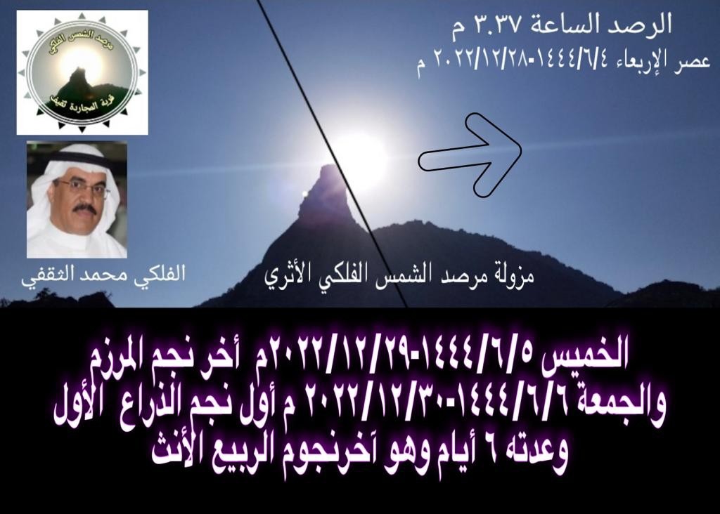 أوضح الفلكي أ.محمد ردة الثقفي خبير مرصد الشمس الفلكي التوقيتين الزراعي العرفي والفلكي قائلاً وحسب آلية مرصد الشمس الفلكي الأثري منذو القدم والمسمى بالتقويم الزراعي العرفي دون الفلكي حيث يتم تتبع حركة الشمس الظاهرية بطريقة نظرية طبيعية من خلال مزولة صخرية تسمى مزولة الشمس ويوقت لها بحسب مسار الشمس ذهاب وعودة  بمى يسمى فلكياً ذهاب الشمس من مدار الجدي جنوب الكرة الأرضية حتى تعود لمدار السرطان شمالاً - في دورة فلكية للأرض حول الشمس لمدة عام كاملاً وحسب رصد النجوم الزراعية المقارن بحركة الظل عصر اليوم رصدنا أخر أيام نجم المرزم ويسمى مرزم الربيع الزراعي وليس الفلكي الذي يقابله شتاءاً وبهذه الطريقة في الرصد وفق مسار الشمس الظاهري فغداً الخميس هو أخر نجم المرزم ويوم الجمعة المقبل أول نجم الذراع الأول وآخر نجوم الربيع الأنث كما هو موضح بالصورة المرفقه للرصد والجدول الزراعي.
