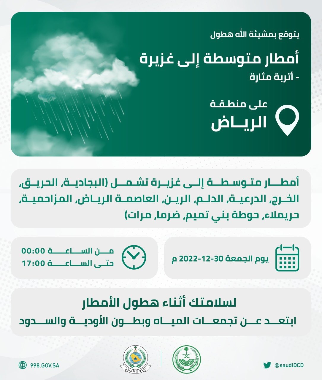 أصدرت المديرية العامة للدفاع المدني تنبيهاً اليوم الجمعة بشأن هطول أمطار رعدية متفاونة ما بين متوسطة إلى غزيرة على منطقة الرياض.