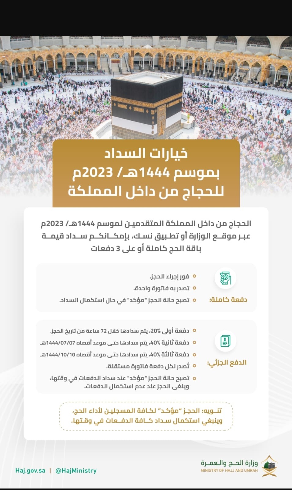 وشددت الوزارة على أن التعاقد على الخدمات المتعلقة بالحج وتقديمها يتم من خلال الشركات والمؤسسات المُرخص لها من قِبل الوزارة بخدمة الحجاج من داخل المملكة والمدرجة في موقع الوزارة، وأكدت على أن يكون التسجيل لأداء الحج من خلال الحاج نفسه، مع الحرص على عدم التعاقد مع أي حملات أو شركات غير مرخص لها من وزارة الحج والعمرة أو غير مدرجة ضمن موقع الوزارة.