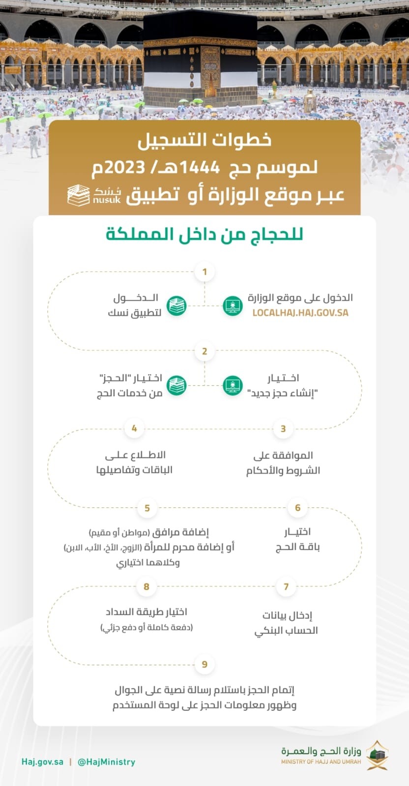 أعلنت وزارة الحج والعمرة عن إتاحة التسجيل المُبكر للحجاج من داخل المملكة عبر موقع الوزارة وتطبيق “نسك”، للراغبين بأداء مناسك الحج للعام الجاري 1444هـ، وذلك في إطار جهود الوزارة المستمرة لتسهيل إجراءات التقديم لأداء مناسك الحج ضمن خطوات سهلة ومُيسرة، بهدف رفع جودة الخدمات، وإثراء التجربة الدينية والثقافية لضيوف الرحمن، تحقيقًا لمستهدفات برامج رؤية السعودية 2030.