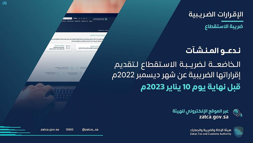 دعت هيئة الزكاة والضريبة والجمارك المكلفين من قطاع الأعمال الخاضعين لضريبة الاستقطاع في المملكة إلى تقديم إقراراتهم الضريبية عن شهر ديسمبر الماضي، وذلك في موعدٍ أقصاه العاشر من شهر يناير الجاري.