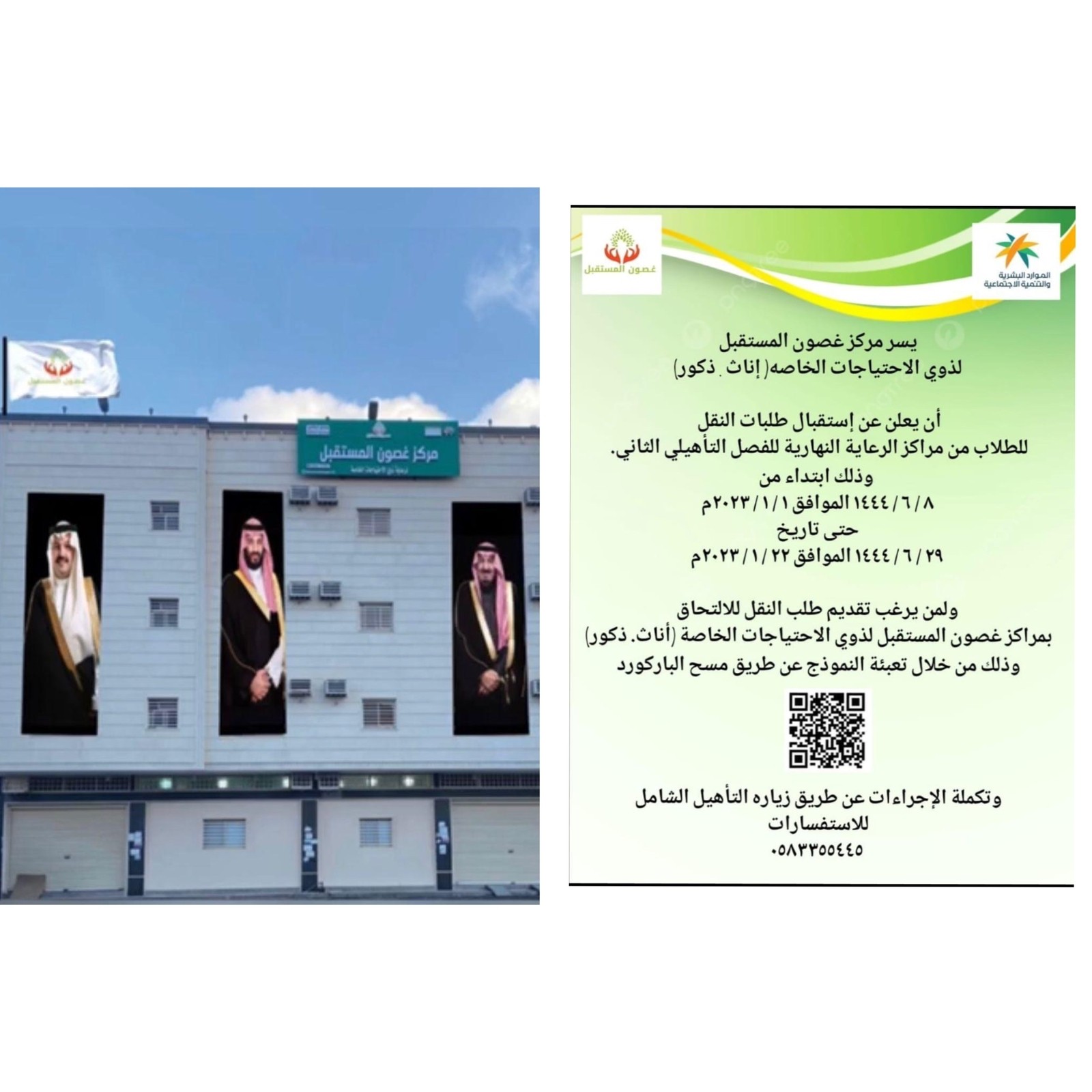 اعلن مركز غصون المستقبل لذوي الاحتياجات الخاصة (إناث- ذكور) عن إستقبال طلبات النقل للطلاب من مراكز الرعاية النهارية الأخرى للفصل التأهيلي الثاني .. وذلك إبتداء من تاريخ 8/6/1444