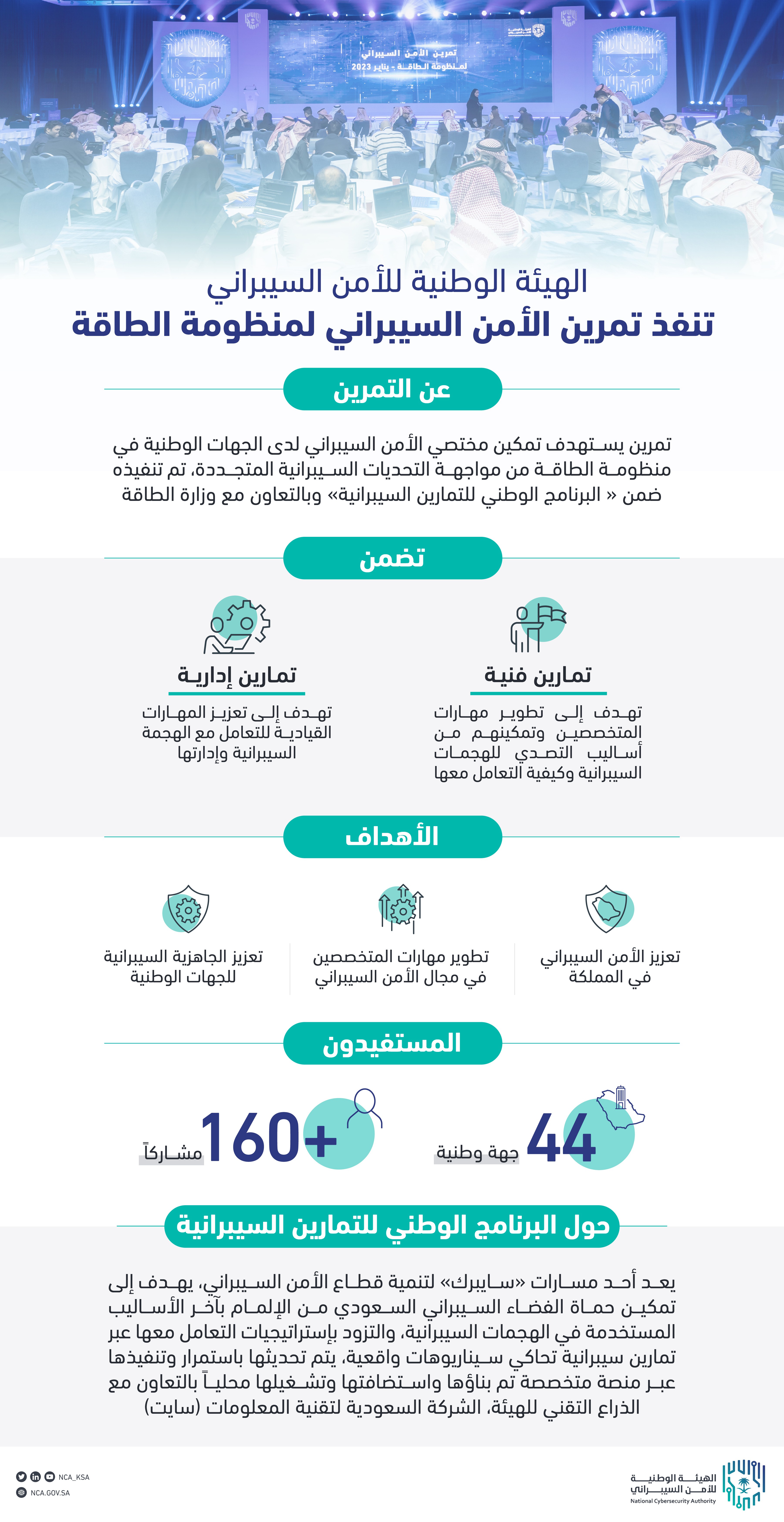 وبينت الهيئة أن التمرين المخصص لمنظومة الطاقة سينفذ على مدى يومين خلال الفترة من 8 إلى 9 يناير 2023م، ويأتي ضمن البرنامج الوطني للتمارين السيبرانية الذي أطلقته لتمكين حماة الفضاء السيبراني السعودي من الإلمام بآخر الأساليب المستخدمة في الهجمات السيبرانية، والتزود بإستراتيجيات التعامل معها عبر تمارين سيبرانية تُحاكي سيناريوهات واقعية يتم تحديثها باستمرار وتنفيذها عبر منصة متخصصة، تم بناؤها واستضافتها وتشغيلها محلياً بالتعاون مع الذراع التقني للهيئة، الشركة السعودية لتقنية المعلومات (سايت).
