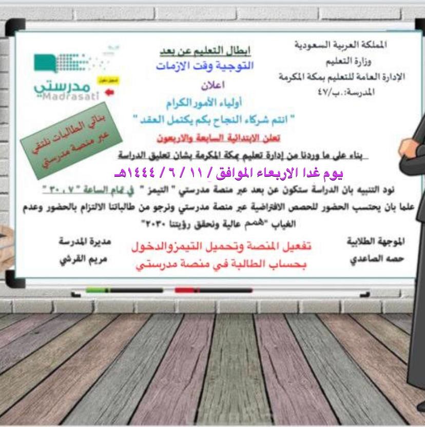 نفذت الابتدائية السابعة والأربعون التابعة لمكتب تعليم شمال مكة بالإدارة العامة للتعليم بمنطقة مكة المكرمة يوم الأربعاء الموافق 11 / 6 / 1444هـ، برنامجاً إرشادياً بعنوان التوجيه وقت الأزمات نفذهُ الموجهة الطلابية حصة الصاعدي بإشراف مديرة المدرسة مريم القرشي.