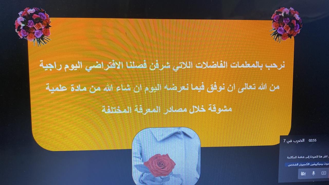 حيثُ تم شرح مفهوم عملية الضرب وايجاد ناتج الضرب في العدد ٧، وكيفية استخدام طرق لتسهيل عملية الضرب في العدد٧، كما شمل الدرس ترتيب خطوات عملية الضرب لإيجاد العدد المفقود، مع توظيف الاستراتيجيات أثناء الحصة الافتراضية، وتفعيل الرؤية المستقبلية من خلال عملية الضرب فيما حرصت المعلمة على الانضباط الذاتي لدى الطالبات