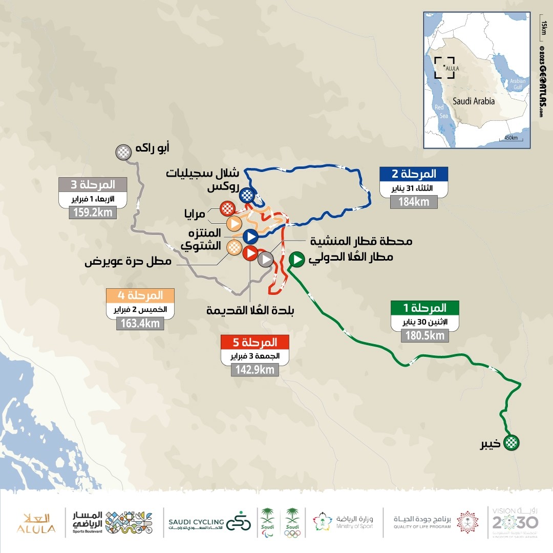 - المرحلة الأولى منها تنطلق في 30 يناير 2023م، من مطار العلا الدولي " خيبر"، في مسافة تبلغ 180,5 كلم.