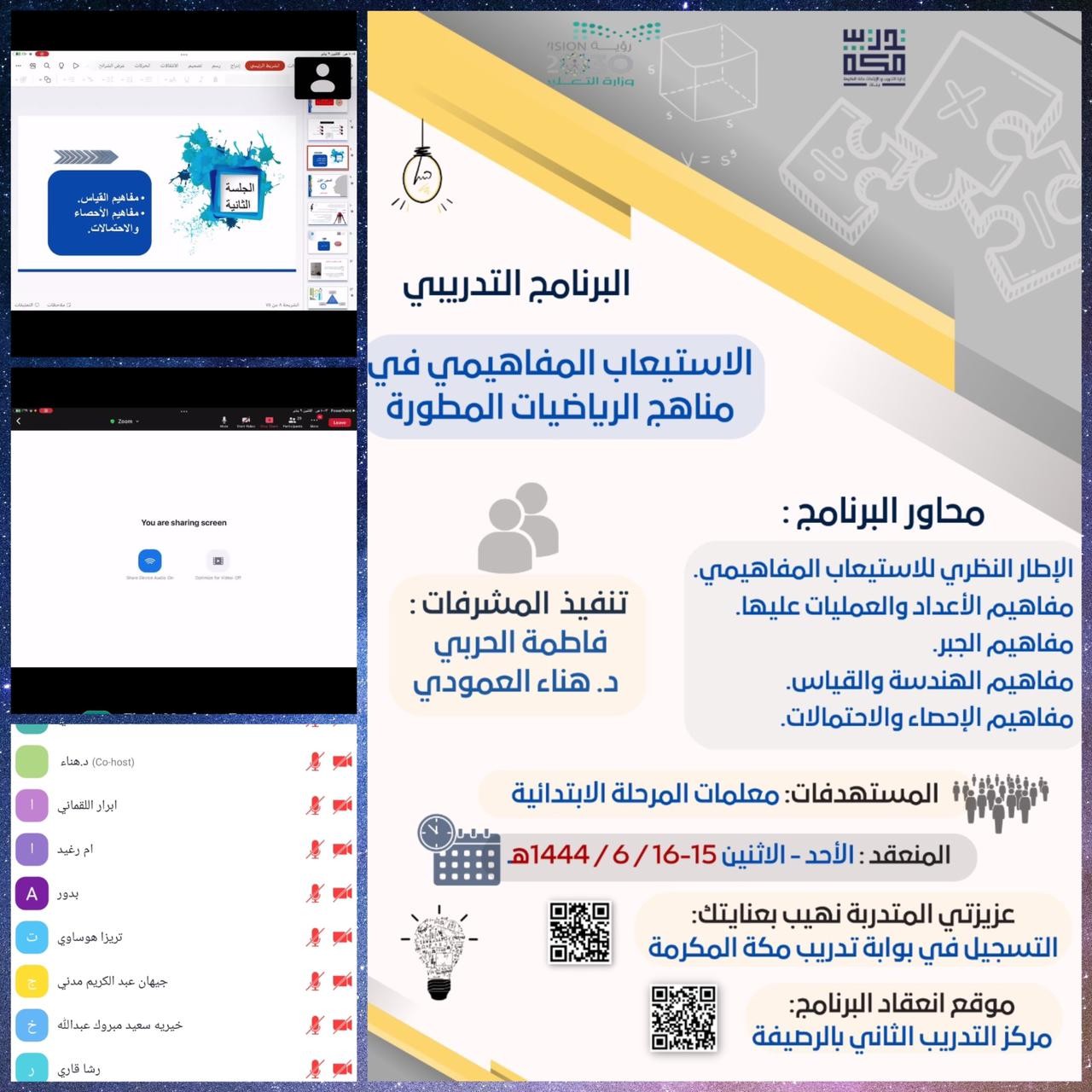 نفذت شعبة الرياضيات بمكتب تعليم غرب مكة بالإدارة العامة للتعليم بمنطقة مكة المكرمة برنامجا تدريبيا للمعلمات بعنوان: (الاستيعاب المفاهيمي في مناهج الرياضيات المطورة) بهدف تحسين نواتج التعلم وذلك يومي الأحد والاثنين 15-16/ 6 / 1444هـ، نفذته مشرفات الرياضيات بالمكتب فاطمة الحربي، هناء العمودي بمساندة المكتب.