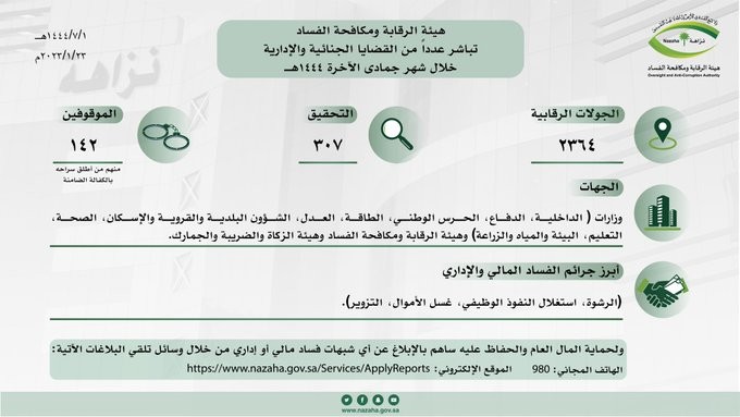 تفصيلاً، قالت هيئة الرقابة ومكافحة الفساد "نزاهة"، إنها باشرت مهامها واختصاصاتها خلال شهر جُمادى الاخرة، بإجراء أكثر من 2364 جولة رقابية.