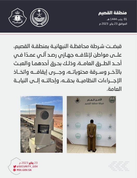 قبضـت شرطة محافظة النبهانية بمنطقة القصيم،علـى مواطن لإتلافـه جهـازي رصـد آلـي عمـدا فـي أحـد الطـرق العامـة، وذلك بحـرق أحدهما والعبث
