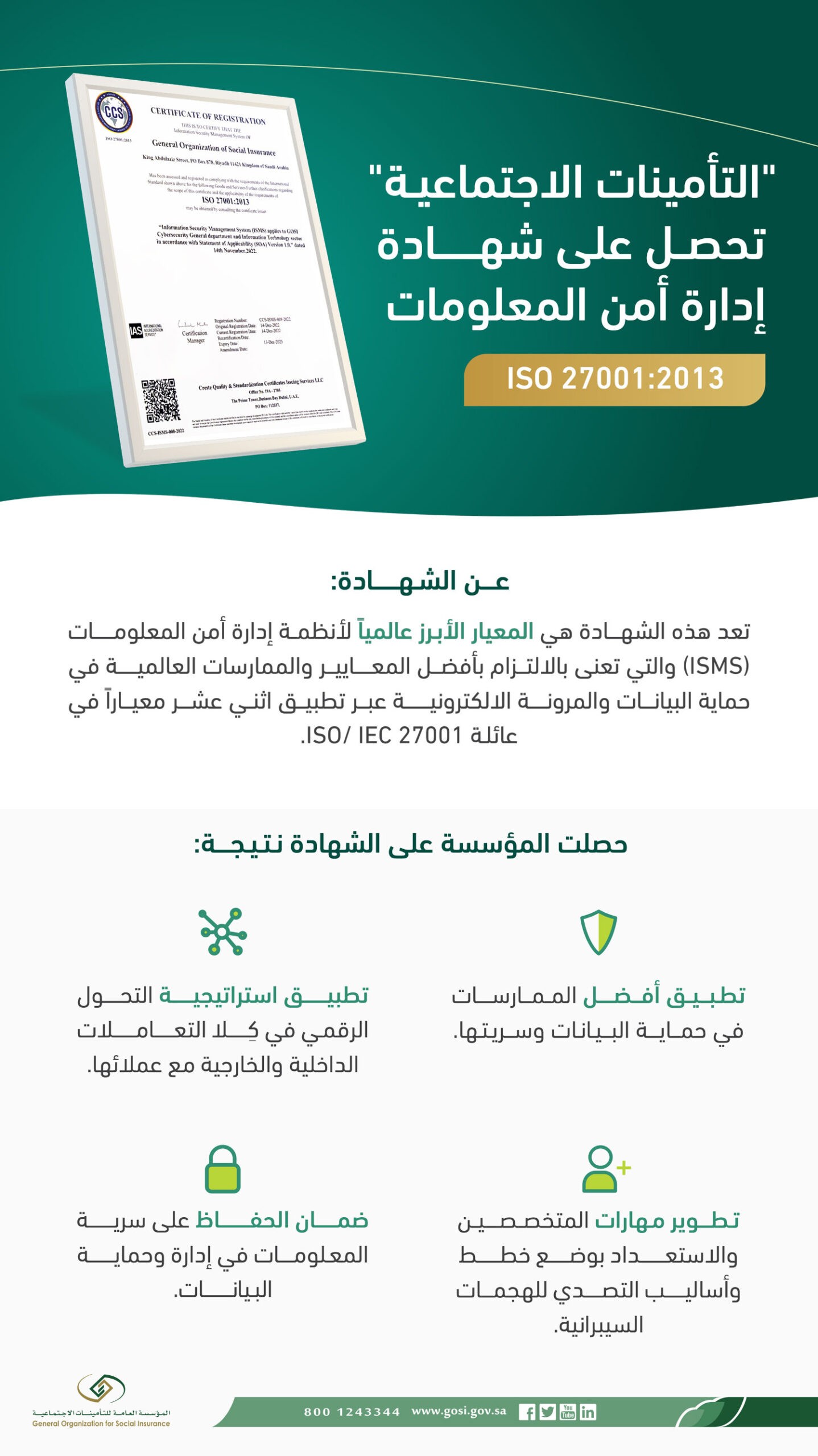 حصلت المؤسسة العامة للتأمينات الاجتماعية على شهادة إدارة أمن المعلومات ISO 27001:2013 نظير جهودها في تطبيق أفضل الممارسات في حماية البيانات وسريتها.